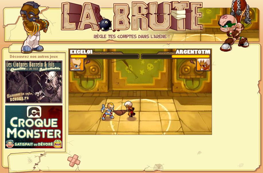 Acum 2 zile mi-a trimis un prieten un link catre un joc destul de distractiv: la brute. Jocul se desfasoara online si iti trebuie zilnic max 5 minute. Trebuie sa iti faci o bruta si sa cauti adversari sa te bati cu ei. Poti avansa in leve si poti obtine arme. Lupta in sine e generata de computer si tu nu poti decat sa privesti, ceea ce face jocul si mai interesant, in sensul ca singurul lucru pe care il poti face este sa alegi adversari slabi unde esti tu puternic. Poti sa ai si ucenici care iti te rasplatesc cand urca ei in level.