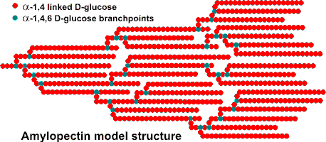 • amylopectin – is a branched, bushlike structure containing (1, 4)-α-D linkages between D-glucose residues and (1, 6)-α-D branch points.